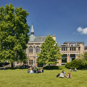 Two distinct design strategies were employed to transform each courtyard. The lower courtyard, leading to a cloistered basement with the imposing gothic arch of the stained-glass Great Hall window, demanded a unique solution. To preserve unobstructed views of this magnificent window from all angles within the courtyard, a contemporary glulam structure with a glass roof was proposed. This structure, suspended from brackets on the courtyard walls, not only maintained an open, column-free floor space but also preserved the asymmetrical arrangement of existing doors and windows, ensuring the space’s characteristic openness was conserved.